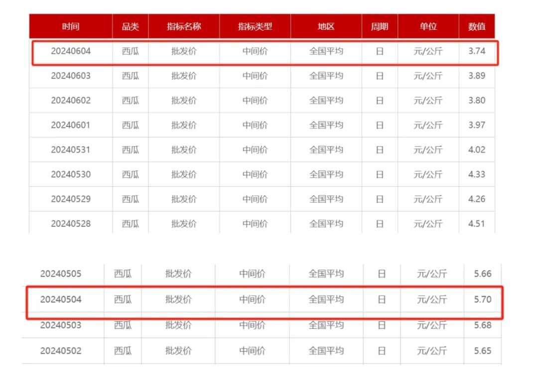 据农业农村部监测数据,6月4日,全国西瓜批发均价为3.74元/公斤,较一个月前的5.70元/公斤降价34.39%。