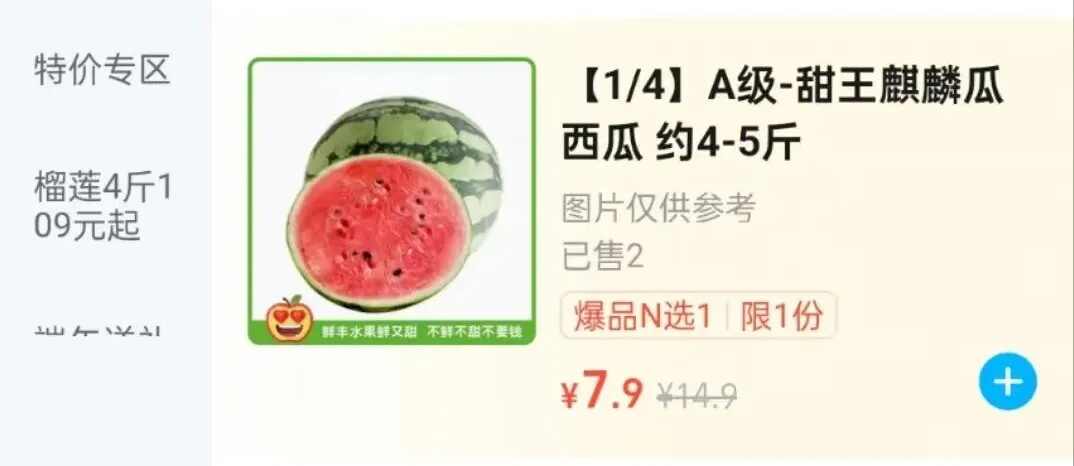 据外卖平台上显示的西瓜零售价格,有的水果店部分西瓜线上价格十分亲民,4-5斤的西瓜算上平台优惠只要7.9元,每斤不到1.6元。