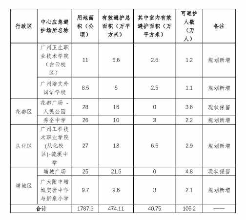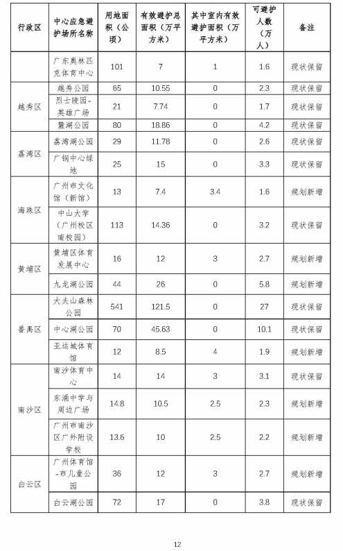 接下来,应急避护场所该如何进一步完善布局规划?征求意见稿提出,综合考虑行政区划、服务人口、救援要求、自然灾害的区域分布特征等因素并结合实际,规划广州市文化馆(新馆)、九龙湖公园、亚运城体育馆等28处中心应急避护场所。