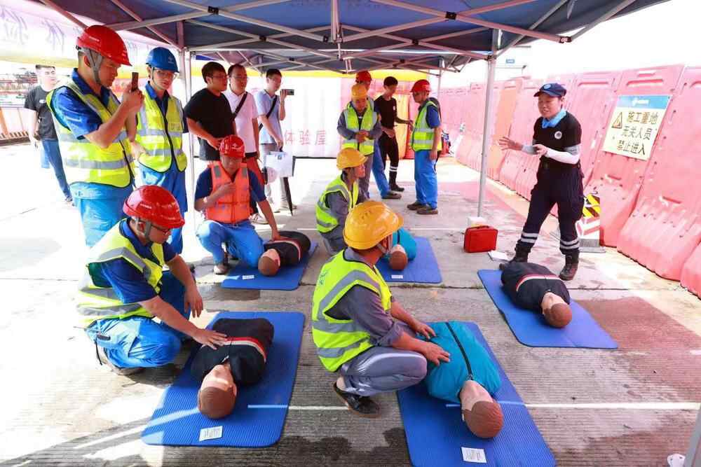 演练分为三防应急演练、受困应急救援和火灾消防应急疏散三个情景。其中三防应急演练是模拟受恶劣天气影响,项目施工场地即开展沙袋围堵、积水强排、船舶避险和组织人员疏散撤离。受困应急救援是模拟施工人员在紧急撤离时,不慎踩空摔倒后的救援行动;火灾消防应急疏散是模拟项目部因电线短路引发火灾后开展人员疏散、初期火情处置。