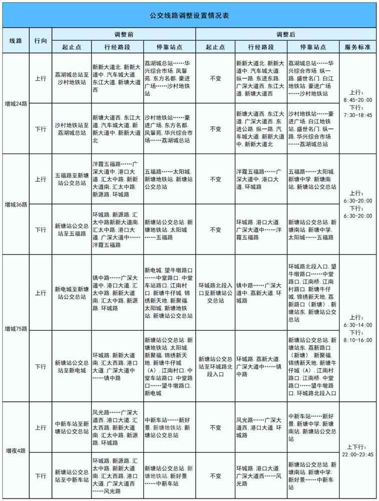 二、调整增城36路。双向取消行经新新大道南、汇太中路、新源路,相应调整停靠站点。