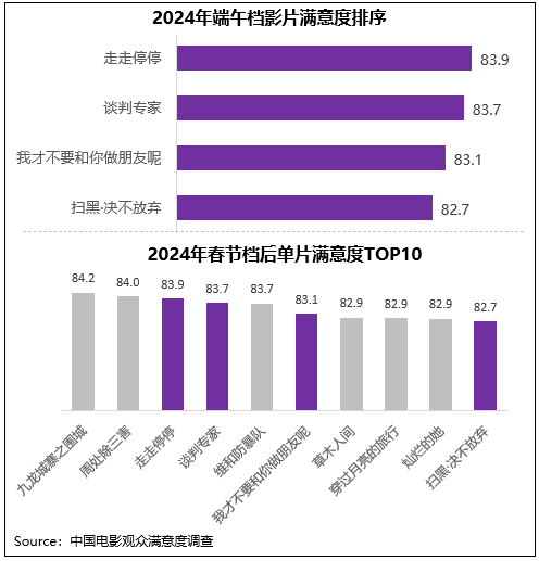 统计显示,2024年端午档新上映影片达10部,比2023年同期及今年五一档均多出2部。在主调查的四部影片中,《走走停停》《谈判专家》分别以83.9分、83.7分位居观众满意度前两位。