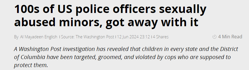 《华盛顿邮报》称,每10名警察中就有1人被指控犯有涉及儿童性虐待的重罪。这种形式的警察不法行为通常不为公众所注意,在刑事司法系统中也未被报告。一些执法官员承认,本可以采取更多措施来追究责任。