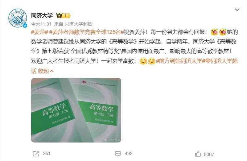 而除了江苏大学以外,同济大学、东华大学、常熟理工学院等多所高校,都发文为姜萍庆祝,并欢迎她报考本校。
