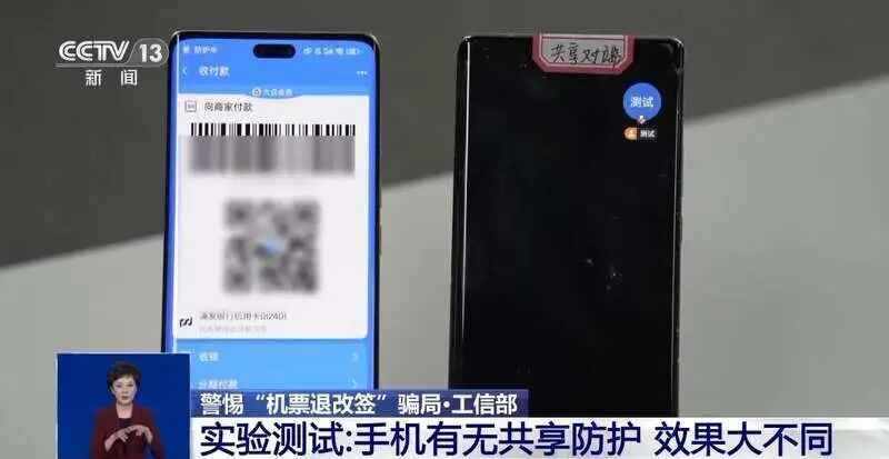 在测试使用手机支付程序付款码时,采取防护措施的手机会自动对共享端的付款码界面进行黑屏处理;而没有防护技术的手机则把付款二维码直接暴露在另一部共享手机的屏幕上。