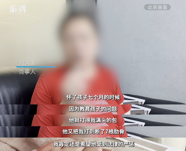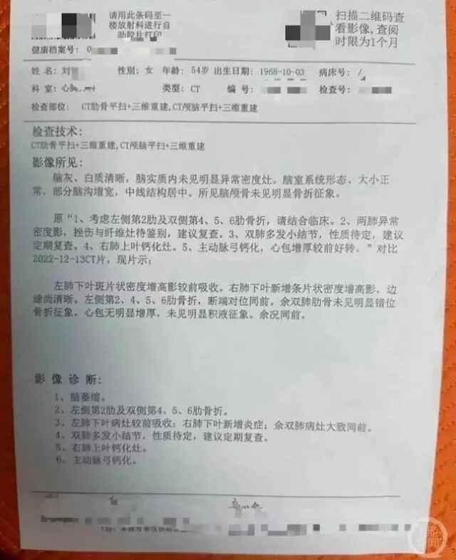 2022年12月11日,在居住的长沙家里,因为女儿向宋某讨教生活细节问题,“他突然没有任何征兆地暴跳,用拳连续猛地击打我的头部、手部和胸部,然后用脚踹我的胸部,持续时间长达近半个小时。我的头皮当时就出血,手部和肘部有多处淤青。”当天22时左右,刘女士的胸部出现剧烈疼痛,在儿子的陪同下到医院急诊进行紧急处理,经过医院CT检查及诊断,其左顶部头皮组织肿胀,同时左侧第2、双侧第4、5、6前肋骨折。