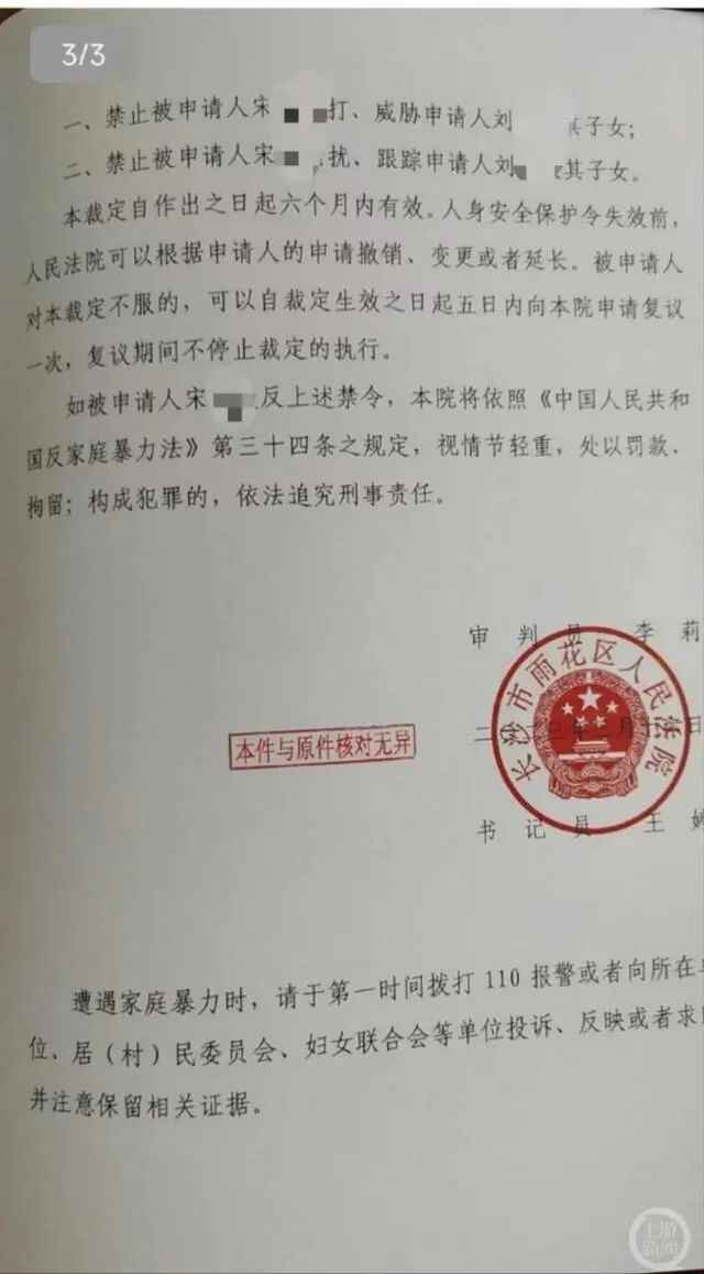 2023年3月1日,雨花区公安分局决定对宋某涉嫌故意伤害案立案侦查。此后,刘女士向雨花区人民法院申请人身保护令。2023年3月16日,雨花区法院下发民事裁定:禁止被申请人宋某殴打、威胁、骚扰、跟踪申请人刘女士及其子女。