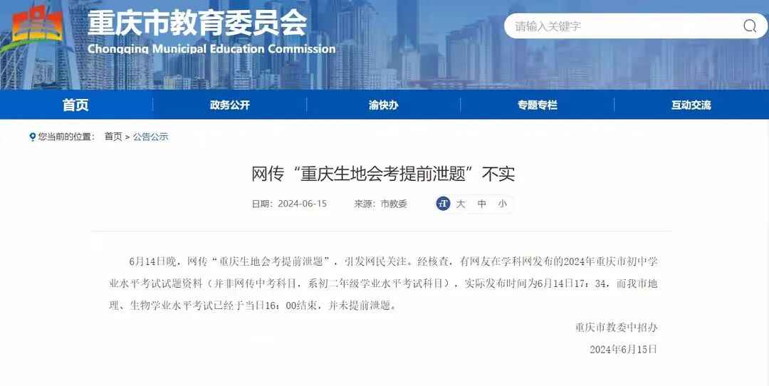 据“重庆辟谣”微信公众号消息,6月14日晚,网传“重庆生地会考提前泄题”,引发网民关注。经核查,有网民在学科网发布的2024年重庆市初中学业水平考试试题资料(并非网传中考科目,系初二年级学业水平考试科目),实际发布时间为6月14日17:34,而该市地理、生物学业水平考试已经于当日16:00结束,并未提前泄题。