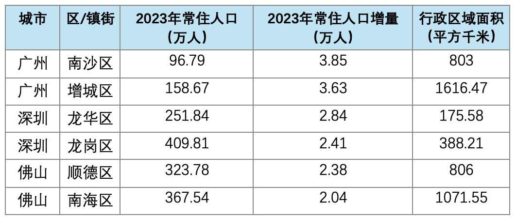 进一步拆解这些人口大市的各区(镇街)表现,也同样可以看到,在区域功能调整、产业政策的引导下,人口在区域间发生了明显流动。根据各市辖区已公布的统计公报,在广深佛三个人口大市中,广州南沙、增城区,深圳龙华、龙岗区,佛山顺德、南海区的人口增量排名靠前。横向对比来看,南沙区行政区域面积排名居中,但是人口基数最低、增量最高,新区的人口流入新趋势最为明显。