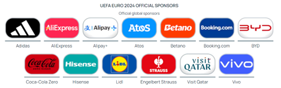 2024欧洲杯共有5家中国企业成为赞助商,创下了史上最多中国赞助商的新纪录,除了蚂蚁集团(含旗下支付宝在内的13个子品牌)外,还有vivo、比亚迪、速卖通和海信。