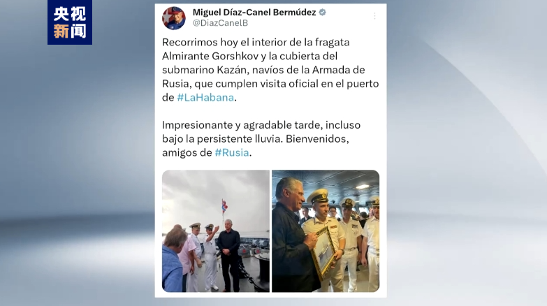 古巴国家主席迪亚斯-卡内尔当地时间15日通过社交媒体发布消息说,他参观了正在访问哈瓦那港的俄海军 “戈尔什科夫海军元帅”号护卫舰,以及 “喀山”号核潜艇,“欢迎来自俄罗斯的朋友们”。
