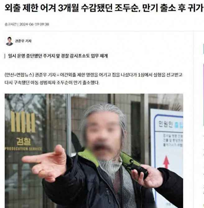 据韩联社报道,韩国电影《素媛》原型罪犯赵斗淳此前因违反“夜间外出限制令”被韩国地方法院判处有期徒刑3个月。京畿道安山檀园警察署6月19日消息称,赵斗淳当天刑满释放。