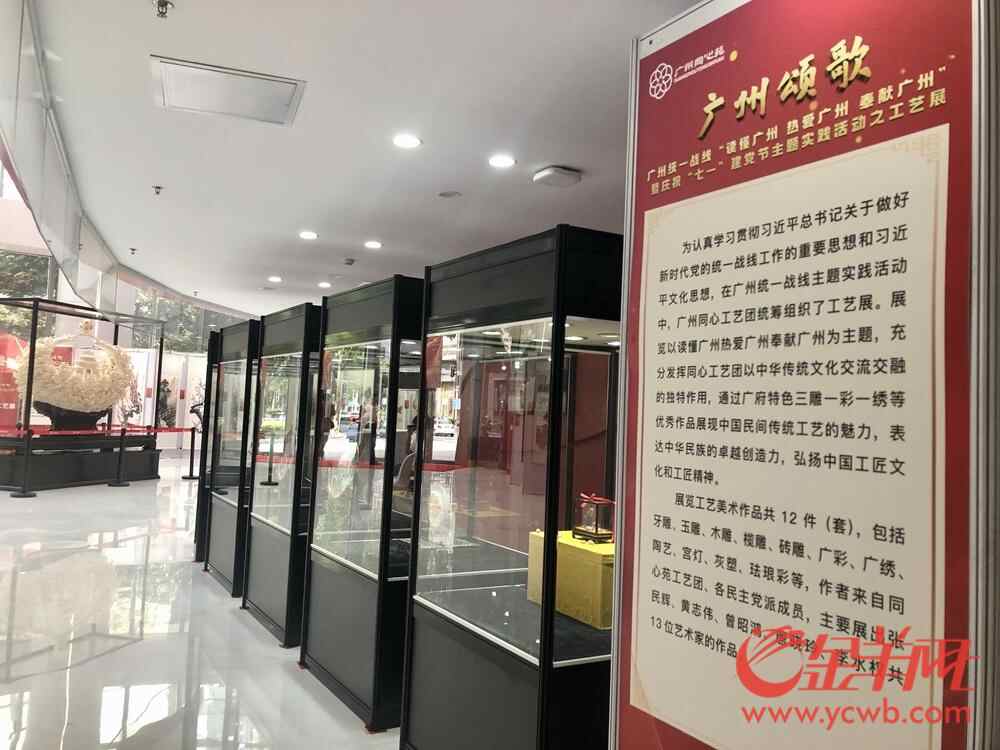 工艺展展示12件(套)工艺美术作品,包括牙雕、玉雕、木雕、榄雕、砖雕、广彩、广绣、陶艺、宫灯、灰塑、珐琅彩等,这些作品由“广州同心苑”工艺团和各民主党派的13位艺术家创作,用广府特色三雕一彩一绣等作品展现中国民间传统工艺的魅力,弘扬中国工匠文化和工匠精神。