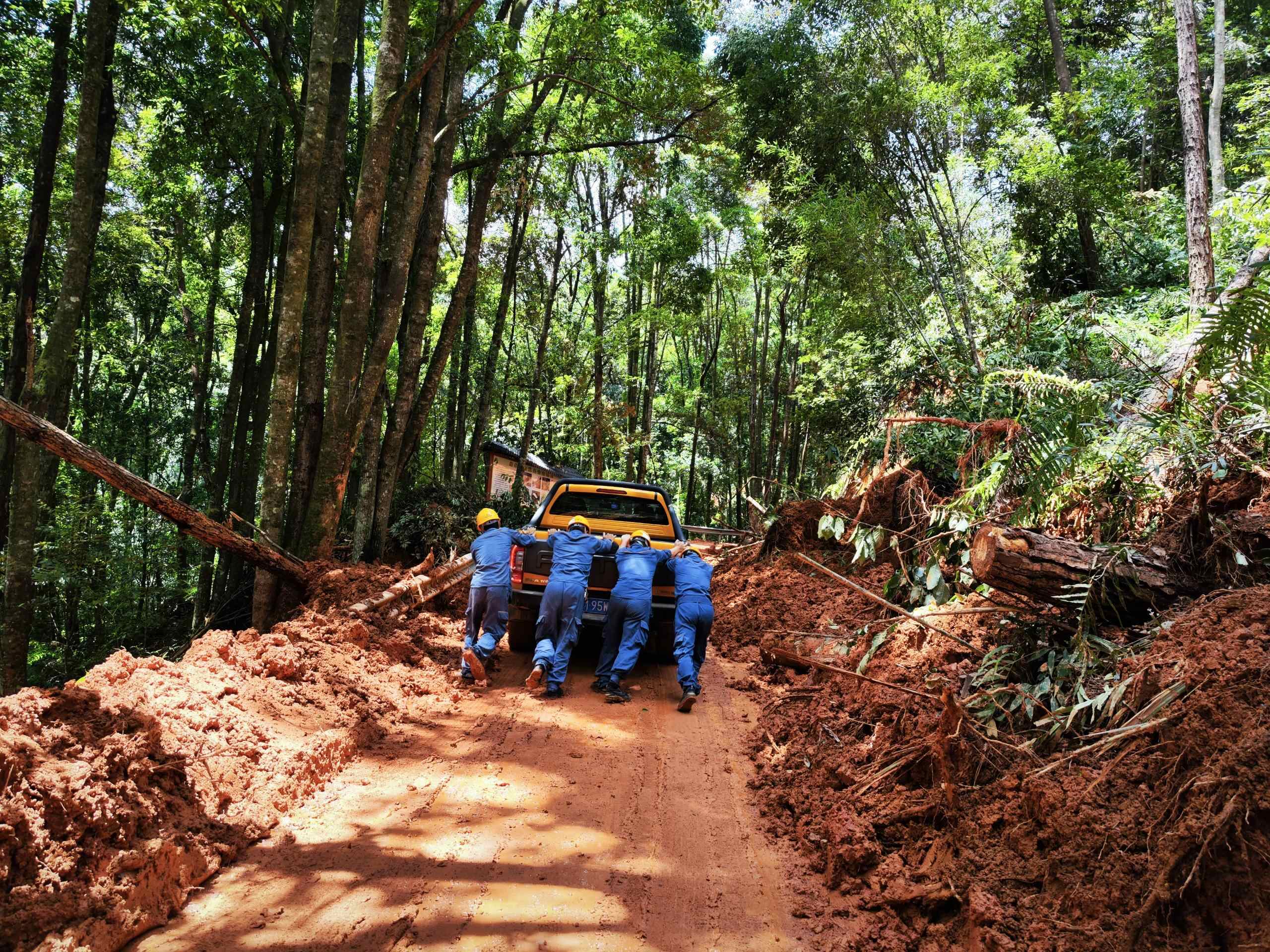 在抢修现场,广东电网的一支支党员突击队冲锋在前,上杆架线、更换受损变压器,运送发电机的车辆在塌方道路上无法前行,他们手抬肩扛,一步一步地将发电车送进村子里。