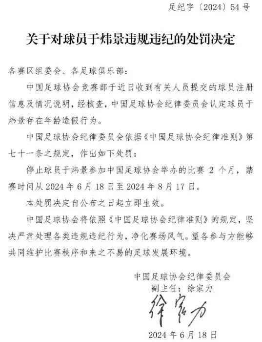 据中国足协官网20日消息,中国足球协会发布关于对球员于炜景、球员黄钰杰违规违纪的处罚决定。因年龄造假行为,于炜景、黄钰杰两名球员均被足协禁赛两个月。