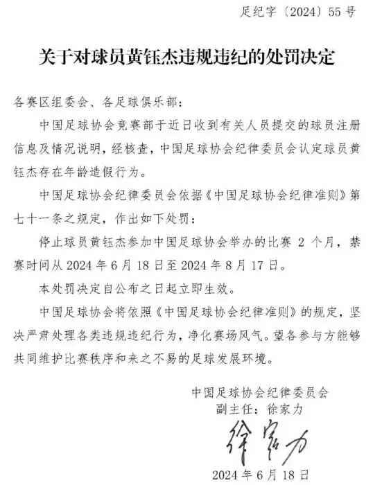 中国足协公布处罚决定