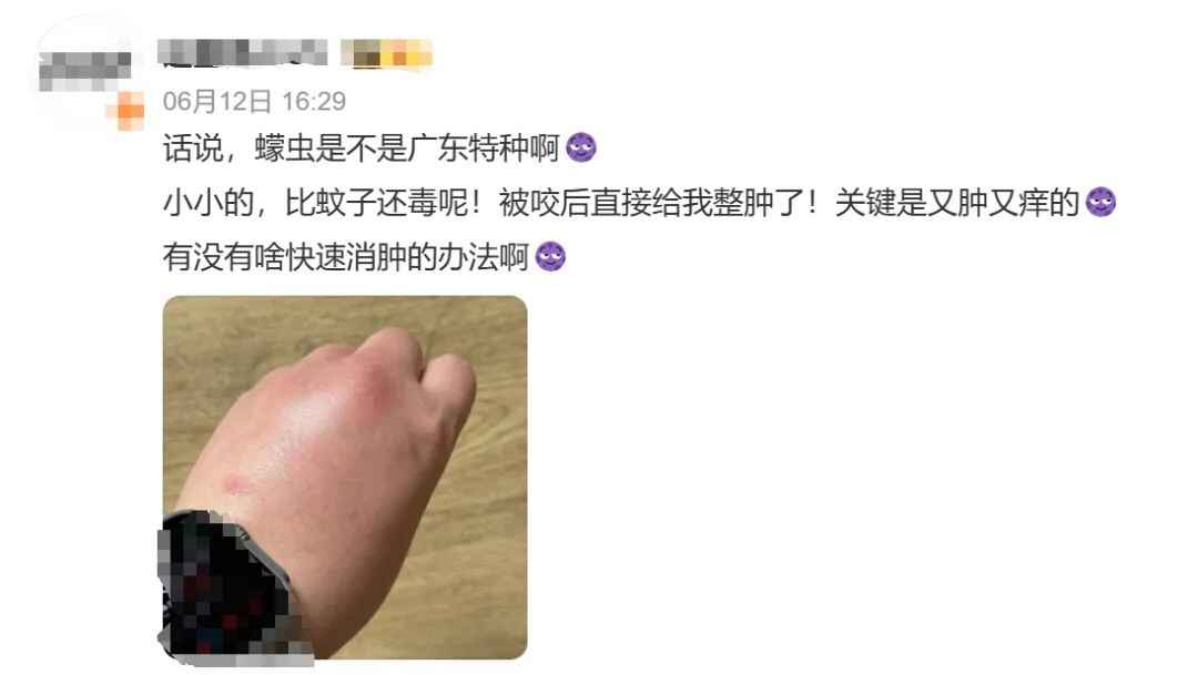 “太惨了,痒死我了!给我咬得密密麻麻,起码50个包以上……”这名网友说,“这蠓比蚊子毒多了,关键是它咬人没感觉,毫无防备,回到家才发现自己成了一群虫子的口粮。”