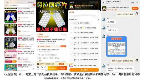 在淘宝平台上搜索劳拉西泮、阿普唑仑、酒石酸唑吡坦等临床治疗焦虑症或抑郁症的药品名称,会发现商家在商品封面图中展示的是上述精神药品的名称,但是在购物车页面,商品名称只标注了“24片x1盒/多盒”,不展示图片及名称。只能在商品详情页的最底部或咨询客服时发现,实际销售的是另一款乙酰天麻素片——一种主要用于治疗神经性头痛的非处方药,允许有资质的店铺出售。