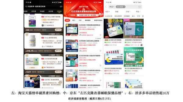 近日,一款“左匹克隆晚安®褪黑素胶囊”登上淘宝和京东排行榜前列,在这两个平台,分别有超过2万人购买了这款胶囊。在拼多多,另一款名为“左匹克隆®珠峰牌晚安胶囊”的褪黑素卖出了10万盒。