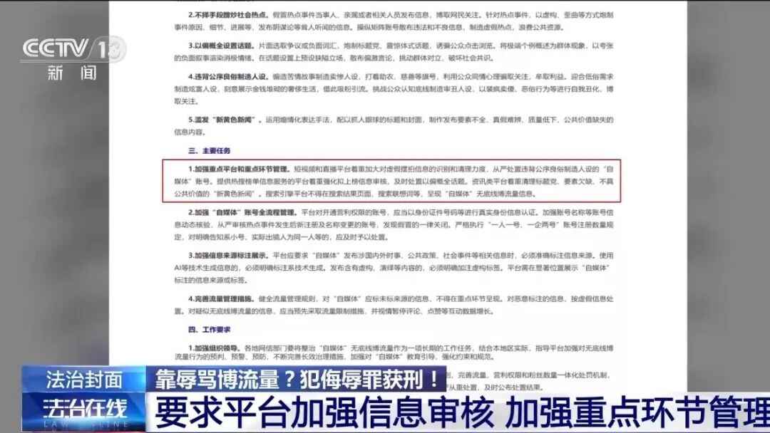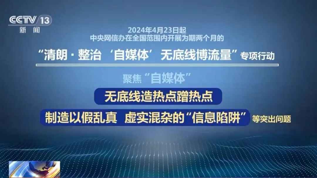 今年4月23日起,中央网信办在全国范围内开展为期两个月的“清朗·整治‘自媒体’无底线博流量”专项行动,聚焦“自媒体”无底线造热点蹭热点,制造以假乱真、虚实混杂的“信息陷阱”等突出问题,从严整治漠视公共利益、违背公序良俗、扰乱公共秩序,为了流量不择手段、丧失底线的“自媒体”。