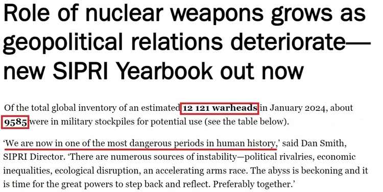 有数据显示,截至今年1月,全球核弹头总数估计为12121枚,其中约9585枚可用,其余为退役但尚未完全拆除的弹头。虽然冷战时期的核武器逐渐拆除,使全球核弹头总数持续下降,但实战部署在导弹和飞机的作战核弹头数量仍逐年增加。