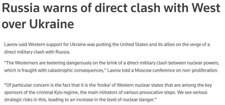 对于美国的咄咄逼人,俄罗斯外长拉夫罗夫此前在莫斯科核不扩散会议上发出警告:“西方国家正危险地处于核大国之间发生直接军事冲突的边缘,这将带来灾难性后果。”