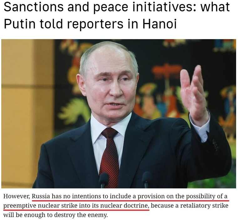 在美国的步步紧逼之下,当地时间20日, 俄罗斯总统普京在越南首都河内回答媒体提问时表示,俄罗斯正在考虑有可能改变本国发展核力量的指导思想,但暂时不需要发动预防性核打击。