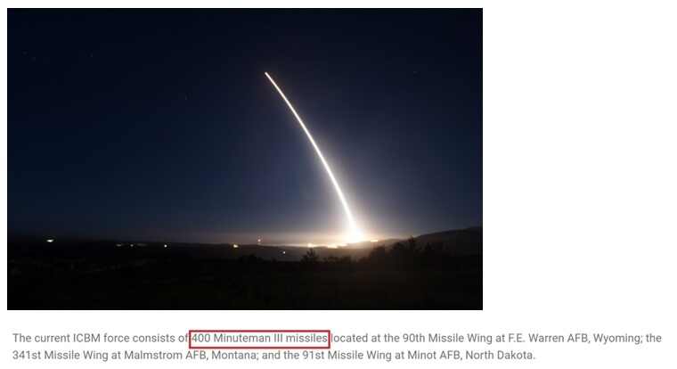 根据美国空军核武器中心的数据,美国空军目前拥有400枚“民兵Ⅲ”洲际导弹,陆基核力量总共部署约800枚核弹头。