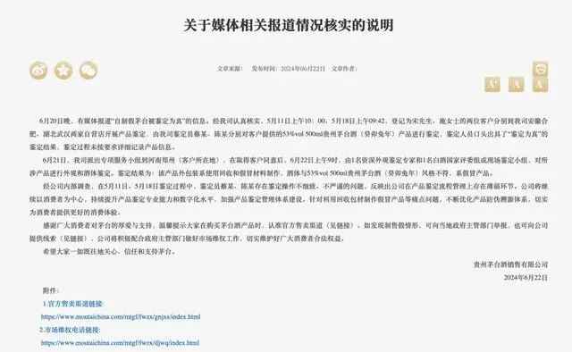 茅台酒销售公司在该说明中称,经公司认真核实,5月11日上午10:00、5月18日上午9:42,登记为宋先生、施女士的两位客户分别到公司安徽合肥、湖北武汉两家自营店开展产品鉴定,由公司鉴定员蔡某、陈某分别对客户提供的53%vol 500ml贵州茅台酒(癸卯兔年)产品进行鉴定,鉴定人员口头出具了“鉴定为真”的鉴定结果,鉴定过程未按要求详细记录产品信息。