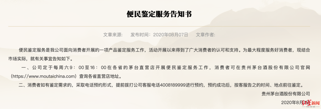 贵州茅台鉴定服务公告。图/贵州茅台官网