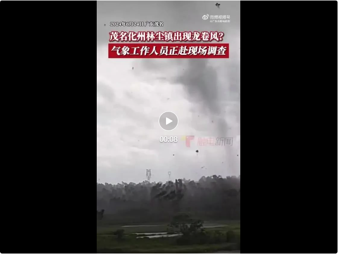 经茂名化州市气象局工作人员现场确认,茂名化州林尘镇尚书堂村、林尘村、新岸村、下车村一带,6月24日上午8时50分左右出现龙卷风,经初步核实,龙卷风造成部分树木折断、果树倒伏。