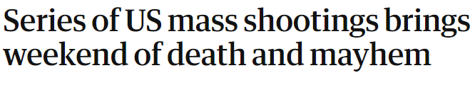 仅周日凌晨,纽约州、亚拉巴马州、密苏里州和俄亥俄州就发生了四起枪击案,造成至少1人死亡,34人受伤,其中一起枪击事件现场发射的子弹数量至少有362发。此外,周五在阿肯色州一家杂货店发生的枪击案造成 了4死9伤;周六在肯塔基州某夜总会发生的枪击案造成1死7伤。