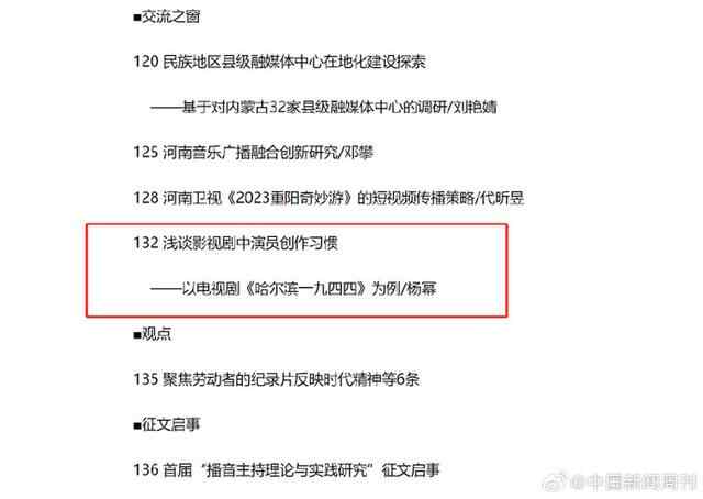 近日,演员杨幂在学术期刊发表文章一事引发关注。据报道,国家广电总局主管、中国广播电视社会组织联合会主办的学术期刊《中国广播电视学刊》(CSSCI扩展版、北大中文核心)在2024年第六期发表了一篇名为《浅谈影视剧中演员创作习惯——以电视剧为例》的文章,作者为演员杨幂,该文章刊登在《中国广播电视学刊》(中广学刊)2024年第6期“交流之窗”栏目。