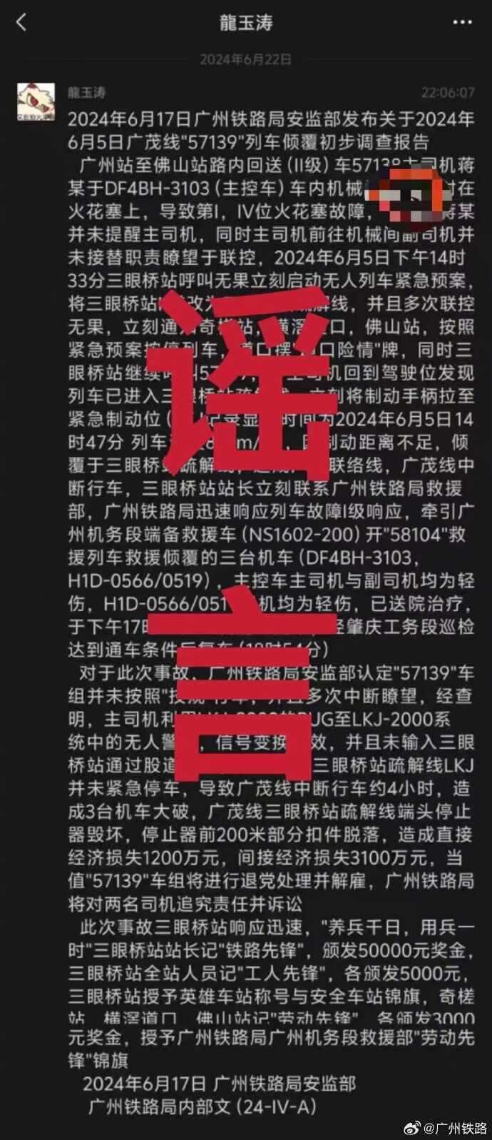 近日,网传“广州铁路局安监部发布关于2024年6月5日广茂线57139列车倾覆初步调查报告”。经核实,6月5日广茂线未发生任何铁路安全事故,该信息内容纯属杜撰。铁路部门已向公安机关报案调查处理。请广大网民不信谣、不传谣、不造谣,共同维护良好的网络生态环境。