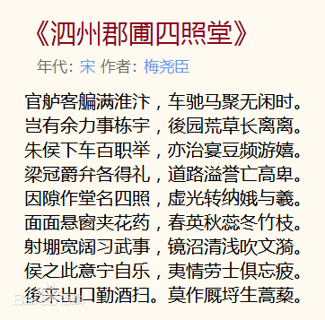 北宋诗人梅尧臣在《泗州郡圃四照堂》中用舻、艑、车、马等交通工具的来来往往衬托泗州的繁华,留下了“官舻客艑满淮汴,车驰马骤无闲时”的佳句。
