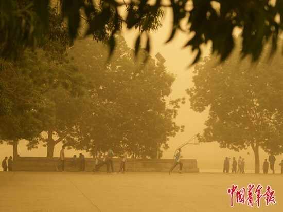 这时候,学生们仍站在操场上说话,上课铃响了,才慢慢踱回楼里。学校外面,路边的人就坐在沙雾里吃烧烤,出租车大敞着窗户载客,骑电动车的人偶尔眯起眼睛,沙子打得脸疼,也绝不戴口罩。之后,人们像扫雪一样,耐心地扫去门口、窗台上的沙土。
