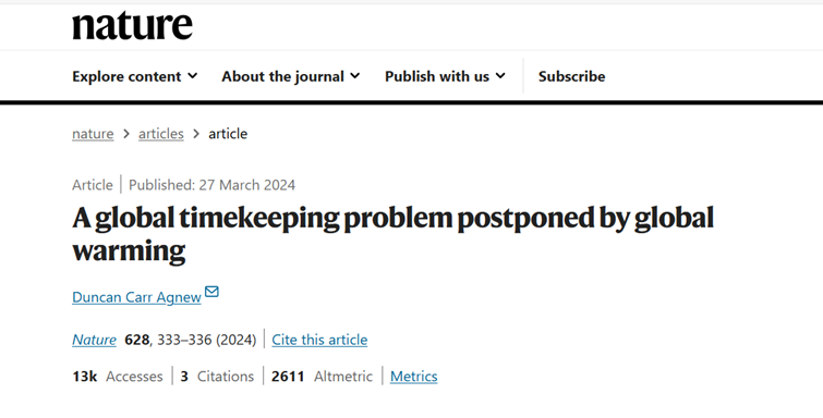 [2]Agnew, Duncan Carr. "A global timekeeping problem postponed by global warming." Nature 628.8007 (2024): 333-336.