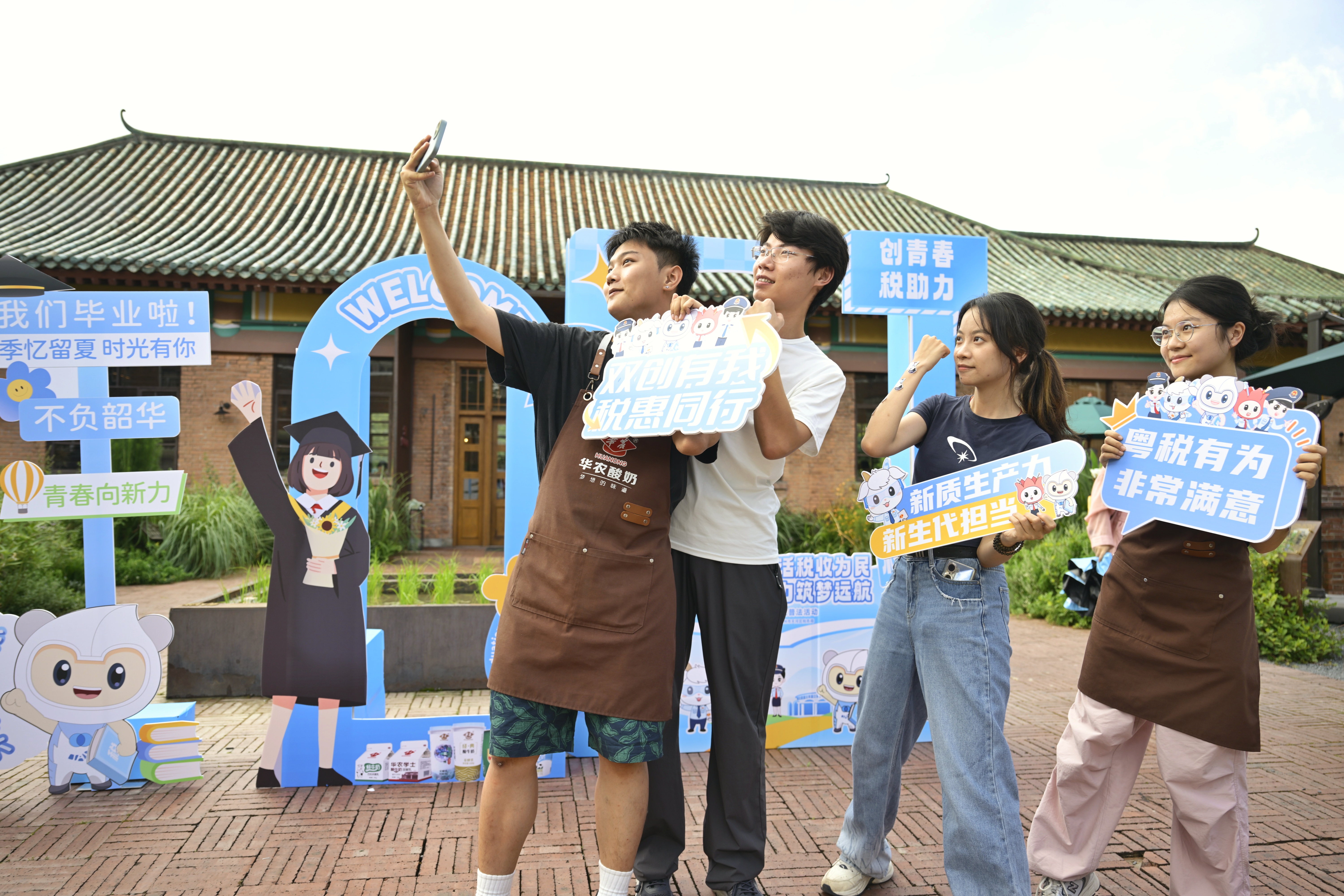 活动当天,华农酸奶文化馆人声鼎沸,大学生们有的前往咨询摊位了解税费知识,有的在税收宣传打卡墙欢乐自拍,还有的积极参与游戏闯关活动。