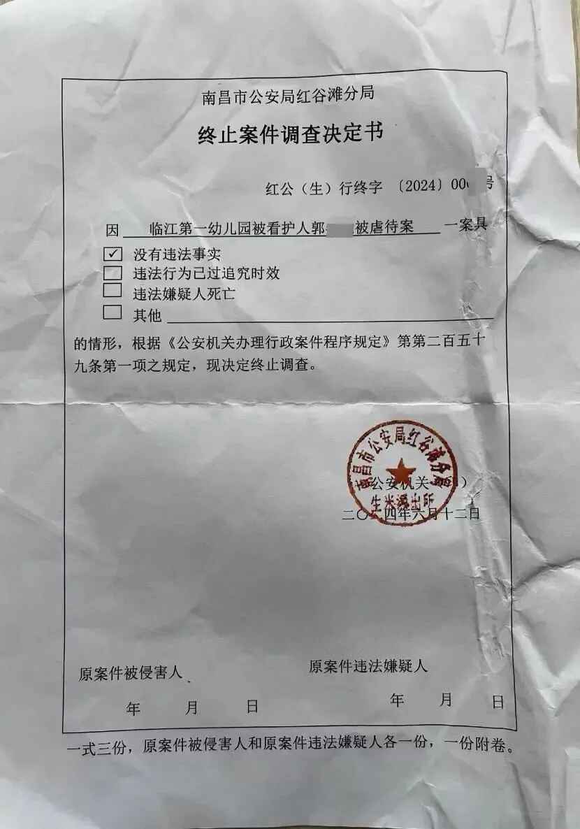 据王女士提供的法律文书显示,6月12日,当地派出所作出终止案件调查的决定,理由是“没有违法事实”。