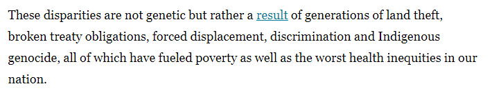 埃伯利指出,造成这些差异的并不是遗传因素,而是针对美国原住民群体的数代之久的土地盗窃、对条约义务的违反以及他们被迫承受的流离失所、歧视和种族灭绝,所有这一切都加剧了美国的贫困以及最为严重的医疗不平等。