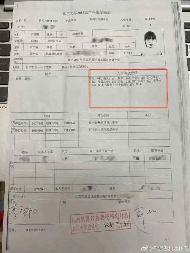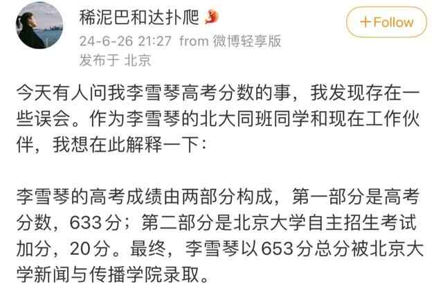 李雪琴游泳二级运动员风波还牵扯出网友对其高考成绩的讨论。记者注意到,一名自称是李雪琴北大同班同学和现在工作伙伴的网友发声,其提到李雪琴的高考成绩由两部分构成,第一部分是高考分数,633分;第二部分是北京大学自主招生考试加分,20分。最终,李雪琴以653分总分被北京大学新闻与传播学院录取。“自主招生不考察体育成绩,不是体育类加分。李雪琴的成绩仅由高考成绩和自主招生两部分构成,没有涉及体育成绩加分。”