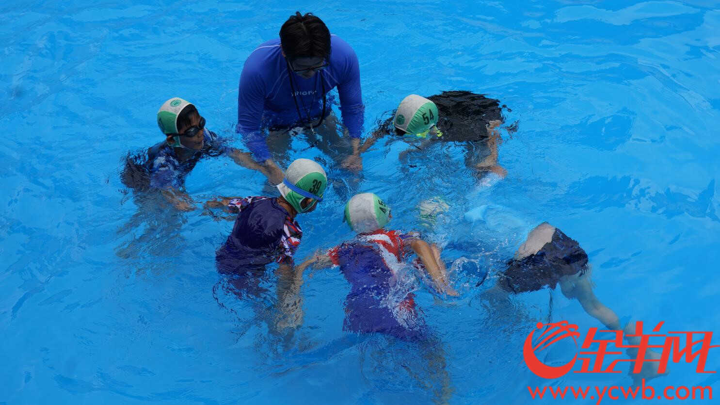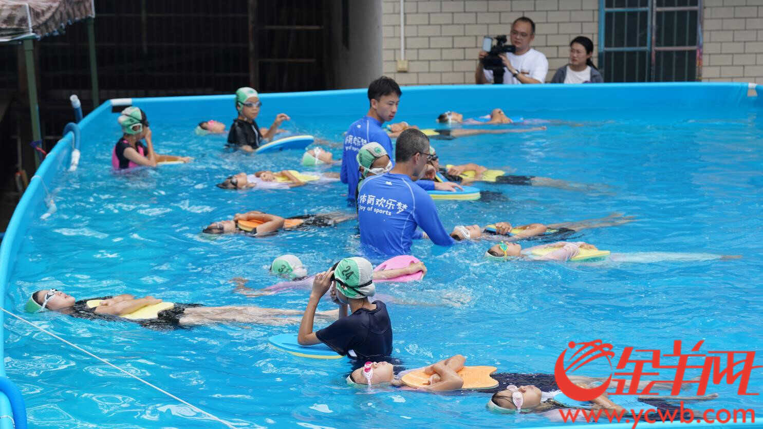 学生们在教练的指导下学习仰泳