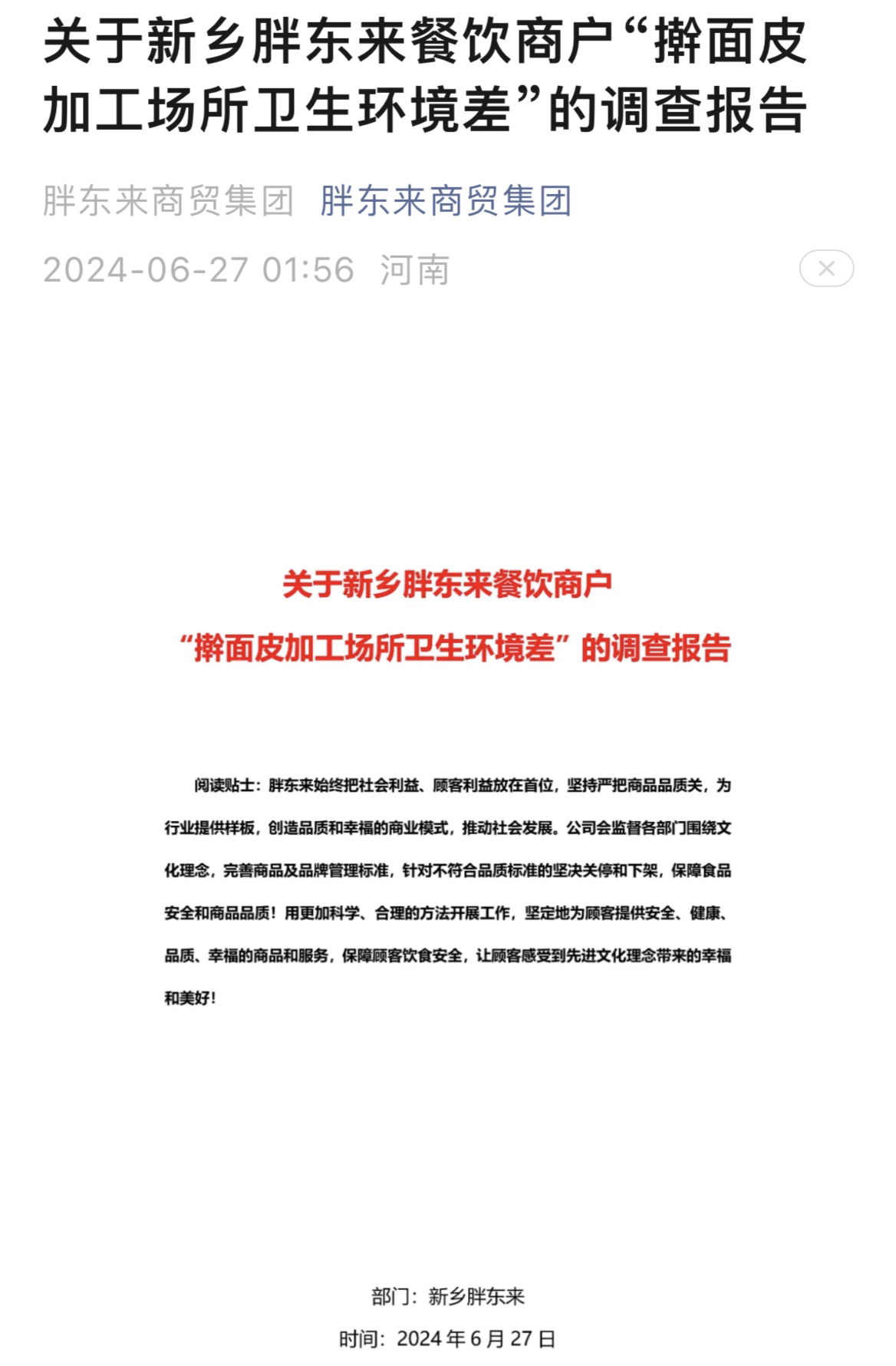 6月27日凌晨,“胖东来商贸集团”微信公众号发布了长达6页的《关于新乡胖东来餐饮商户“擀面皮加工场所卫生环境差”的调查报告》。