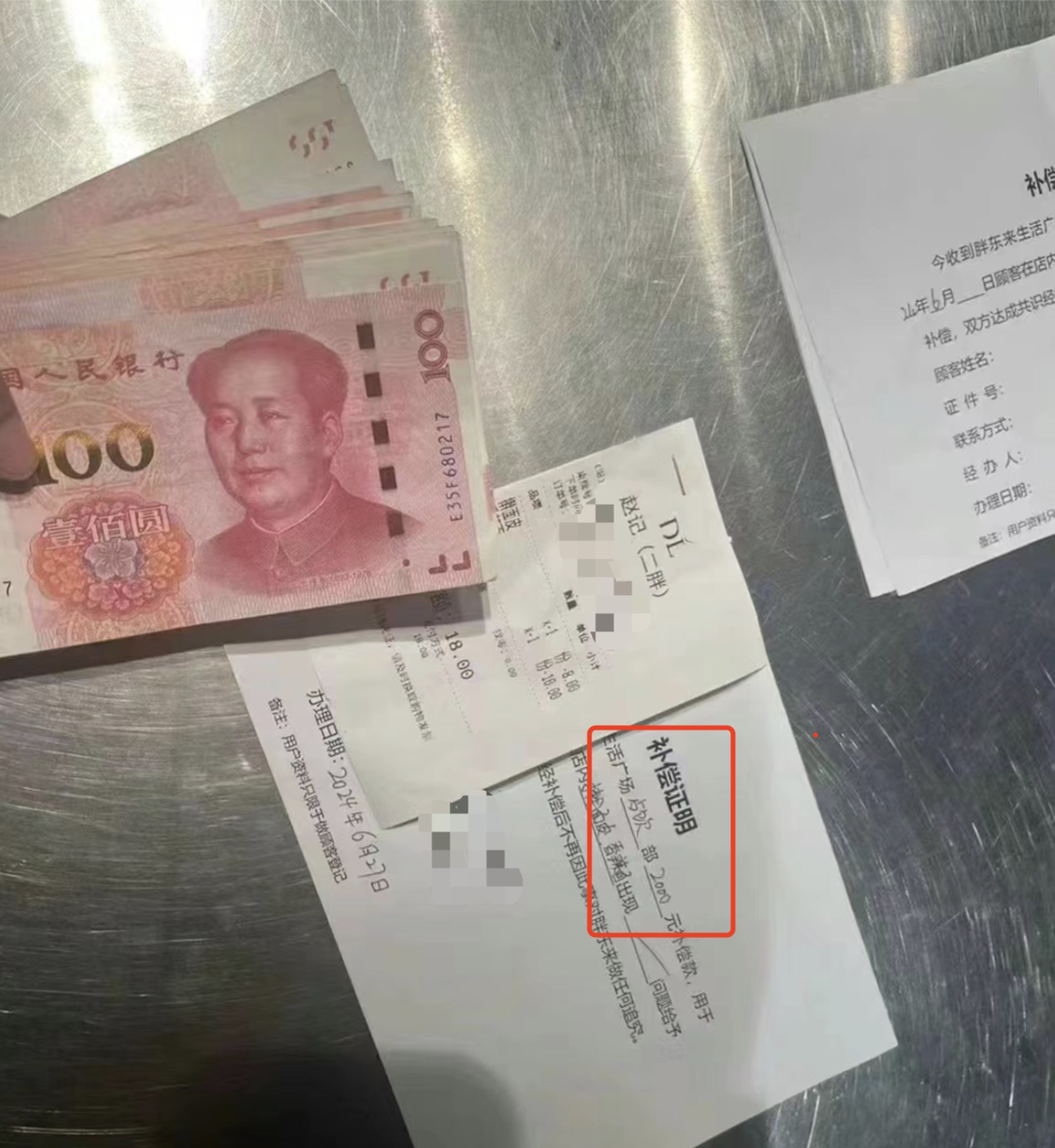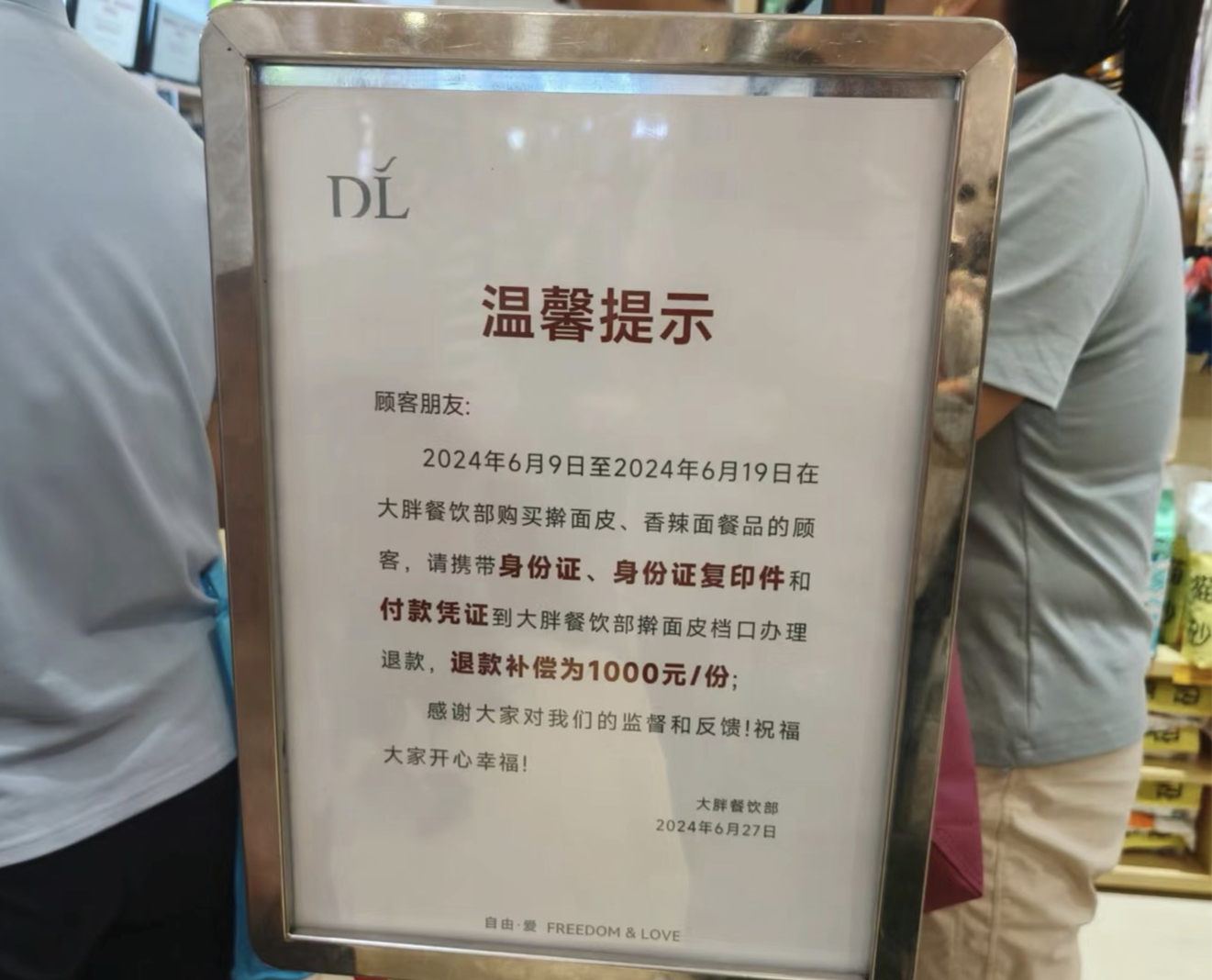 6月27日上午,一名新乡的消费者告诉澎湃新闻记者,自己上午10点左右到新乡胖东来·大胖商场,餐饮部已经放置了《温馨提示》牌,告知消费者在6月9日至6月19日在大胖餐饮部购买擀面皮、香辣面的顾客,可以凭借身份证、身份证复印件和付款凭证到餐饮部擀面皮窗口办理退款,退款补偿为1000元/份。“现场已经有不少人在排队办理了,我看到办理好的人手里拿着一张补偿证明和现金。”该消费者说。