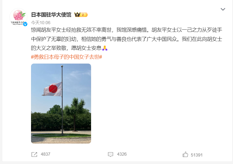 6月28日,日本驻华大使馆发文:惊闻胡友平女士经抢救无效不幸离世,我馆深感痛惜。胡友平女士以一己之力从歹徒手中保护了无辜的妇幼,相信她的勇气与善良也代表了广大中国民众。我们在此向胡女士的大义之举致敬,愿胡女士安息。