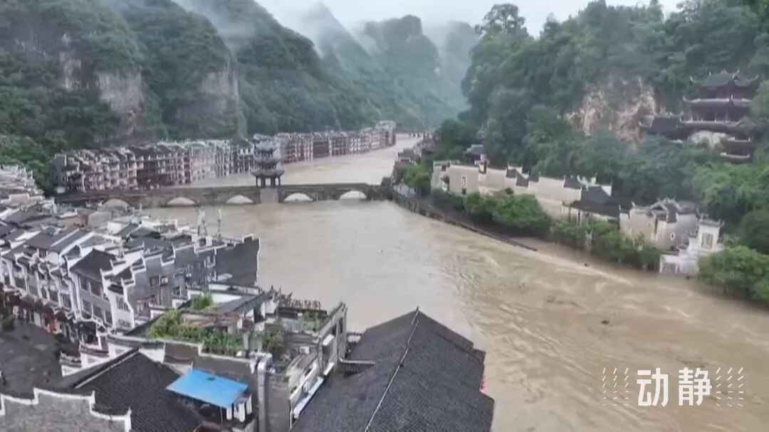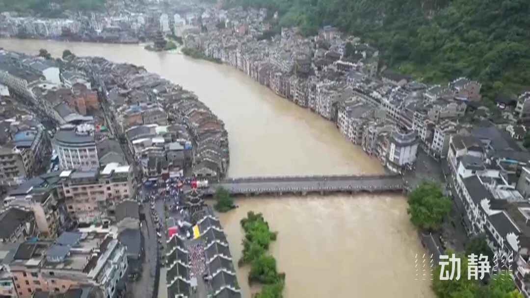 记者从黔东南州镇远县了解到,受强降雨影响,㵲阳河水上涨凶猛,洪水漫过河堤进入镇远古城。截至今天(6月29日)16:00,镇远大菜园水文站监测水位465.30米(洪峰流量3235立方米/秒),已超1996年最大历史水位463.41米,古城内三座桥梁在水量继续增大的情况下有冲毁危险。