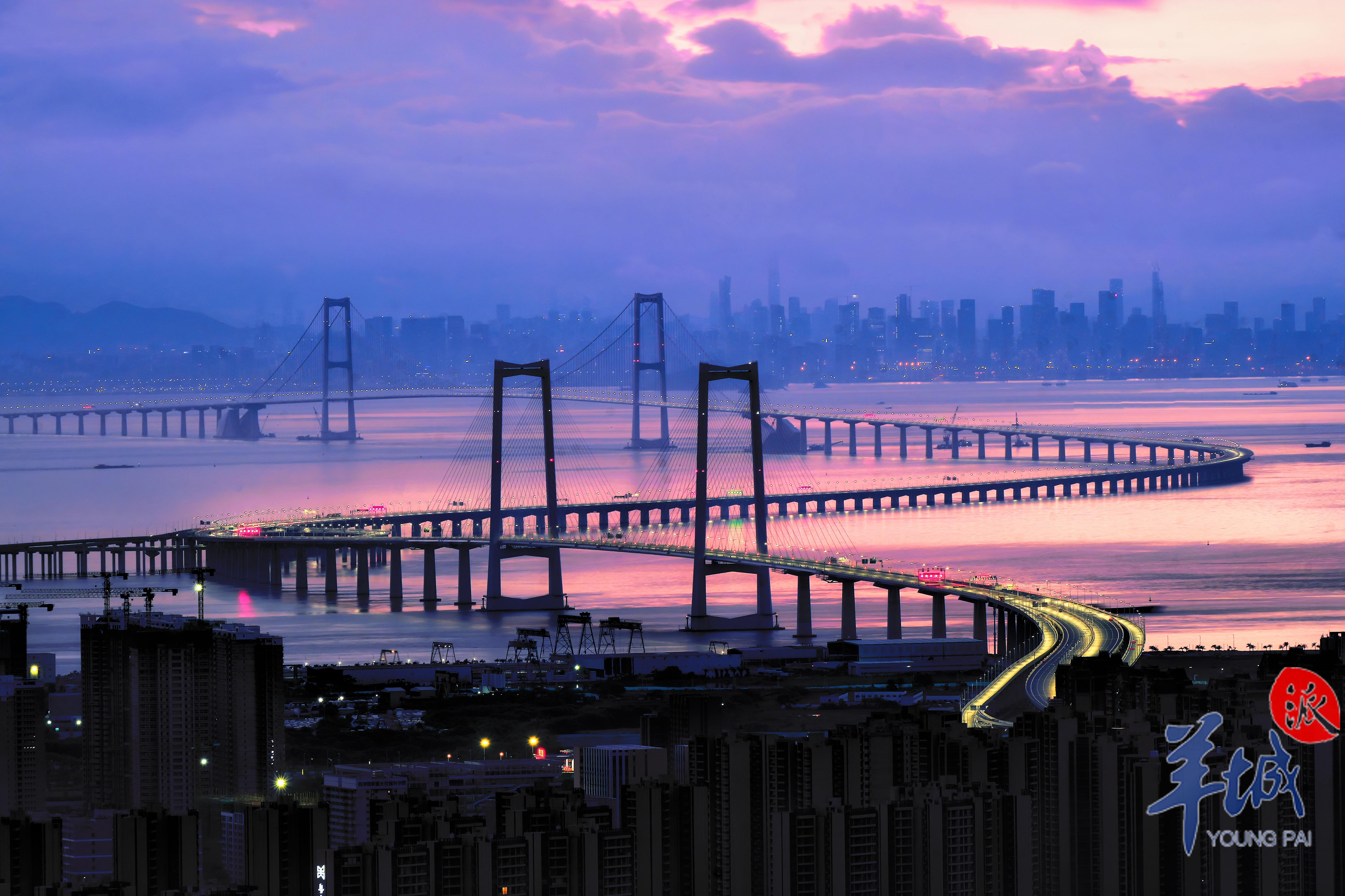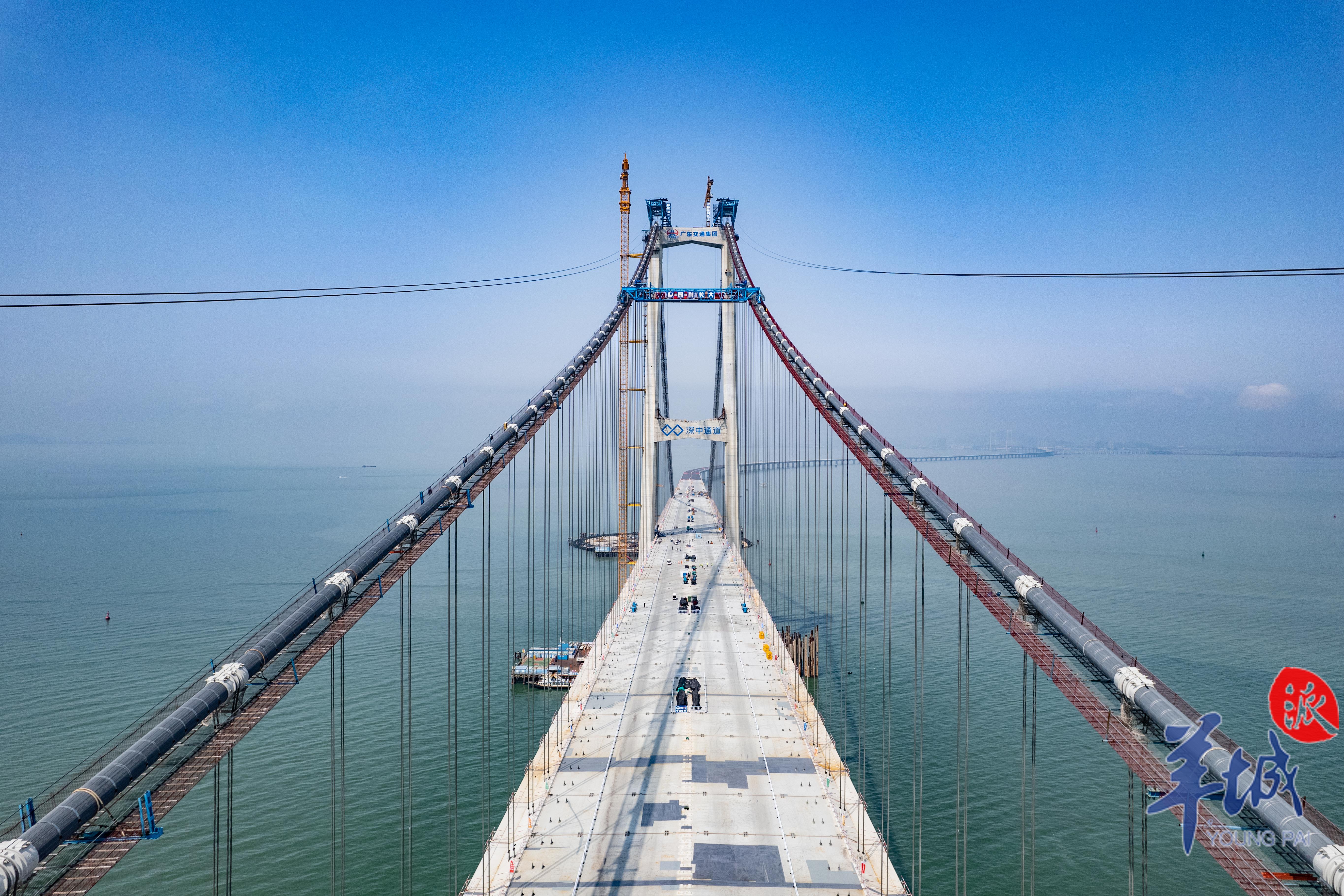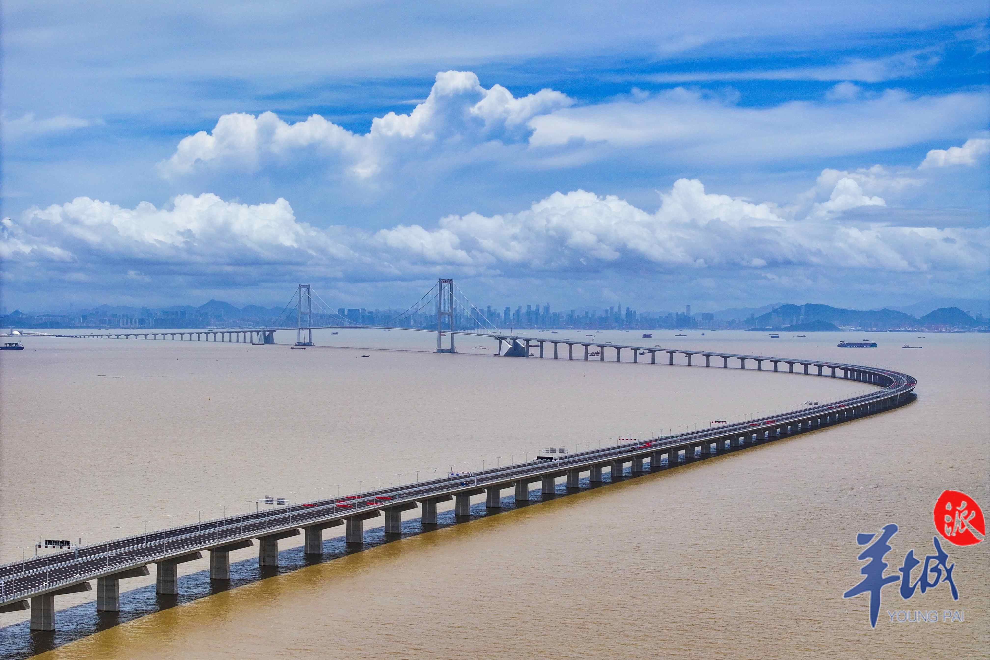 又见长桥卧碧波。这是继港珠澳大桥后,伶仃洋上又一个新时代的超级工程代表作。它集“桥、岛、隧、水下互通”于一体,是世界级跨海通道集群工程、粤港澳大湾区超级工程、粤港澳大湾区关键交通枢纽。
