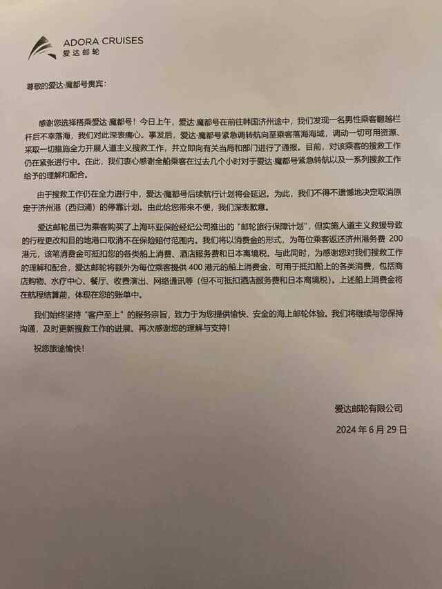 通知写道:今日上午,爱达·魔都号在前往韩国济州途中,我们发现一名男性乘客翻越栏杆后不幸落海,我们对此深表痛心。事发后,爱达·魔都号紧急调转航向至乘客落海海域,调动一切可用资源、采取一切措施全力开展人道主义搜救工作,并立即向有关当局和部门进行了通报。目前,对该乘客的搜救工作仍在紧张进行中。