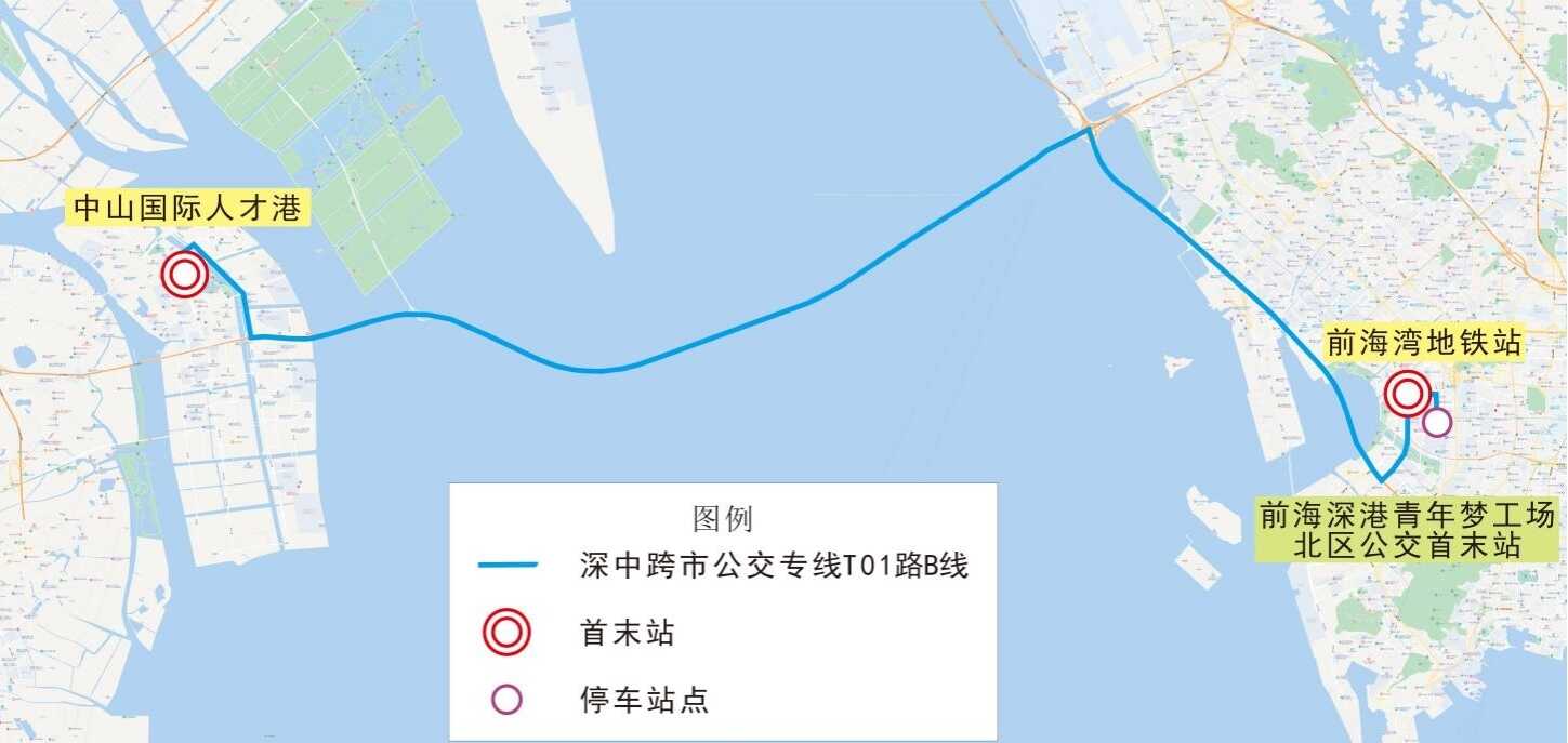 深中跨市公交专线T01路B线起始站为“中山国际人才港—前海湾地铁站”,途经北辰路、未来大道、深中通道、广深沿江高速、前湾三路、听海大道、桂湾二路,途经站点为中山国际人才港、前海湾地铁站(往深圳下客)、前海湾地铁站总站(往中山上客)。