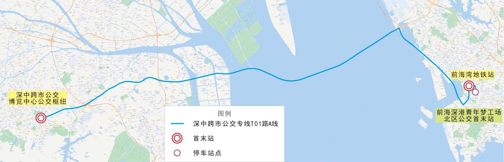 其中,深中跨市公交专线T01路A线起始站为“深中跨市公交博览中心公交枢纽—前海湾地铁站”,途经博爱六路、博爱七路、深岑高速、深中通道、广深沿江高速、前湾三路、听海大道、桂湾二路,途经站点为深中跨市公交博览中心公交枢纽(简称中山博览中心枢纽)、前海湾地铁站(往深圳下客)、前海湾地铁站总站(往中山上客)。